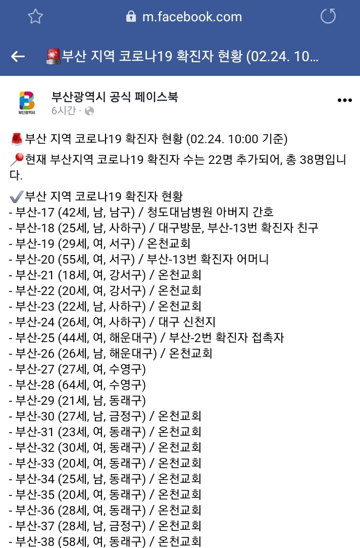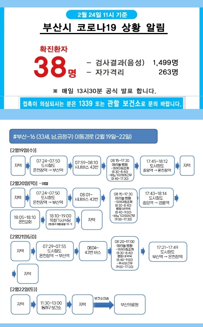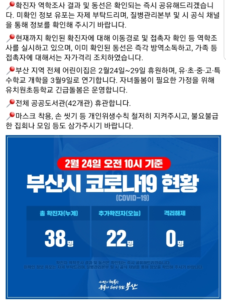 현재 부산시도 2월 21일부터 꾸준히 확진자가 늘고있는 추세입니다. 24일 현재 공식적으로 발표된 확진자수는 38명입니다.