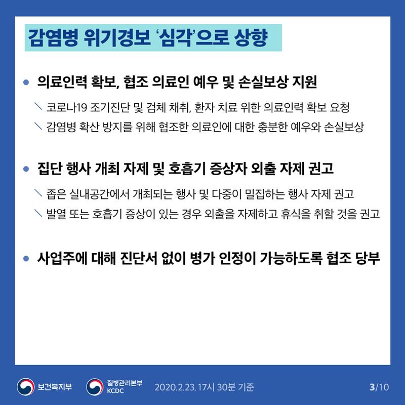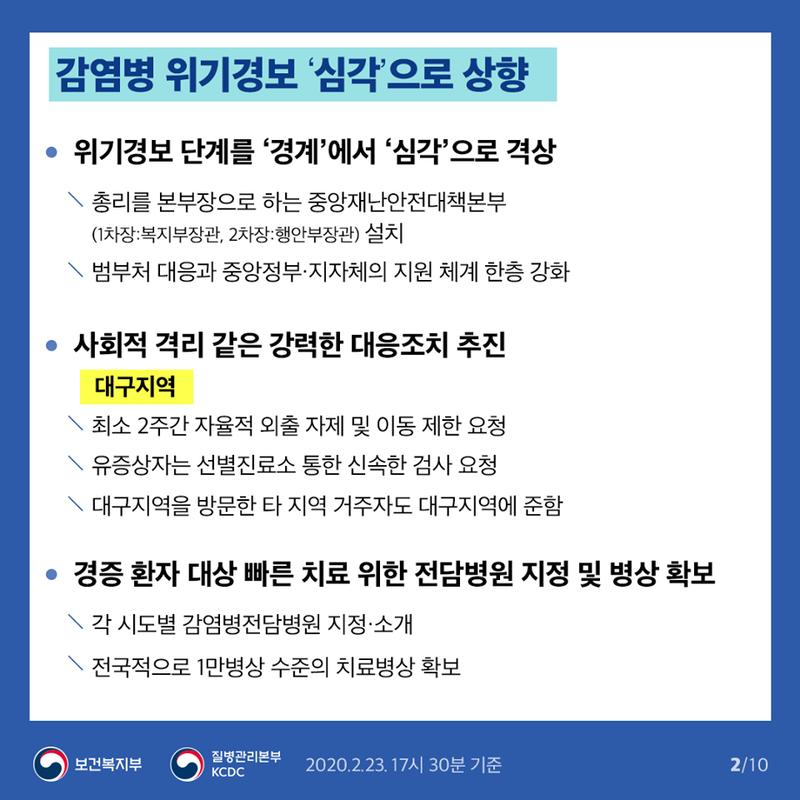국내에선 2020년 1월부터 시작되었던 코로나 바이러스가 계속해서 전국으로 퍼지고 있습니다. 하루가 다르게 감염환자가 늘고있는 가운데 2월 23일 어제, 우리 정부는 감염병위기경보를 '심각' 단계로 격상하며 중앙재난안전대책본부를 설치하고 범부처 대응강화할 것을 발표했습니다. 또한 정부는 전국의 유치원, 초, 중, 고교의 개학일을 3월 9일로 1주일 연기시키겠다고 공식 발표했습니다.