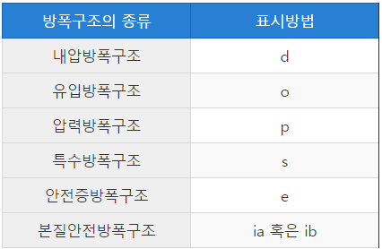 방폭구조의 표시 ![]() 내압방폭구조 : 용기 내부에서 가연성 가스의 폭발이 발생할 경우 용기가 폭발에 견디며 접합면, 개구부 등을 통해 외부의 가연성 가스에 인화되지 않도록 한 구조 ![]()
