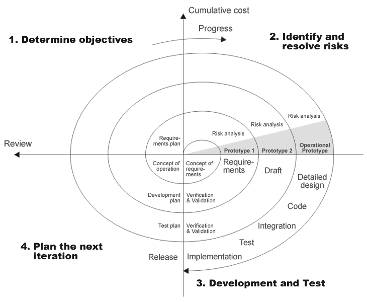 하향식 및 상향식 개념의 장점을 결합하기 위해 폭포 모델의 일부 핵심 측면과 빠른 프로토타이핑 방법론을 결합한 공식 소프트웨어 시스템이 "나선 모델"이다. 특히 대규모 복잡한 시스템에 적합한 의도적인 반복 위험 분석으로 인해 많은 사람들이 무시했었던 주요 영역에 중점을 두었다.